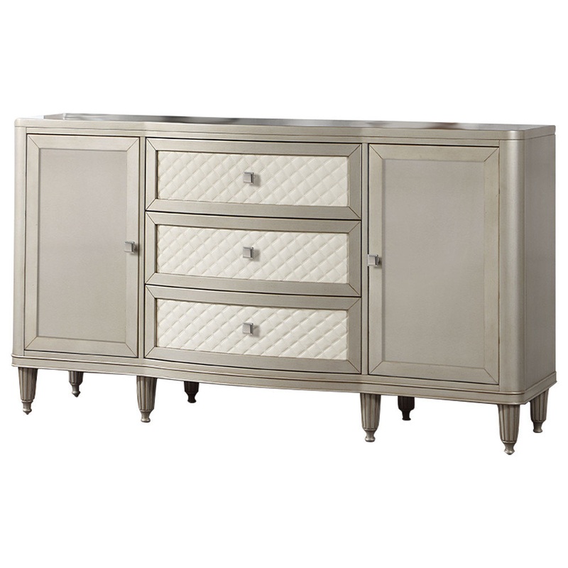 Give your dining space a much-needed storage solution with the Elyssa server. This server features three ample drawers and two side cabinets for all your extra dishware, glassware, and linens. The drawers showcase synthetic leather quilted drawer fronts. The piece sits on eight beautifully crafted fluted wooden legs. It is finished in a champagne color that adds a stylish touch.