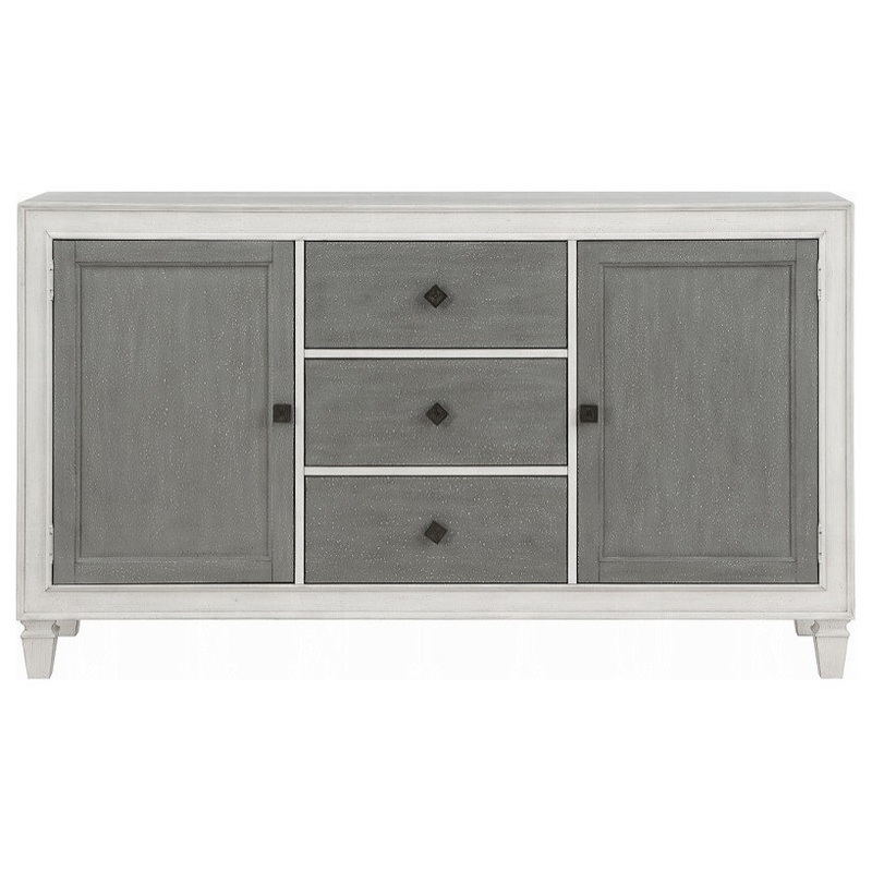Add much-needed storage to your dining area with the Katia server. This server features three ample drawers and two side cabinets with a shelf on each side, perfect for all your extra dishware, glassware, and linens. The drawers and cabinet doors showcase gray fronts for a contrast to the weathered white finish of the outer frame. Metal hardware and wooden legs complete the piece. The piece sits on eight beautifully crafted fluted wooden legs.