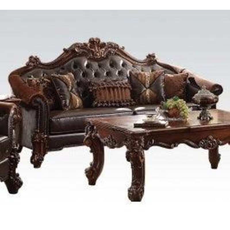 Vendome Collection by ACME Furniture Cherry finish Crafted from wood veneers & solids Regal classical Baroque design Tight back & loose seat cushion Button tufted back Scrolled arm accents w/ light cherry contrast Legs: poly resin ornamental decor Nailhead