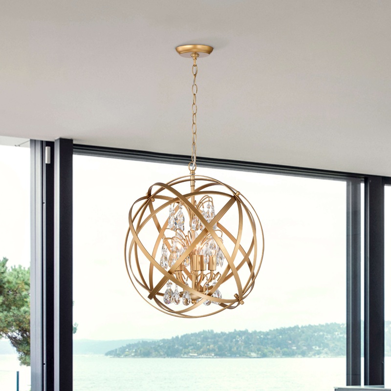 -Yellow-ish Gold finish, the ceiling plate is made of iron; shade: N/A. -Setting: Indoor -Fixture finish: Yellow-ish Gold; crystal: Clear. -Number of lights: 5. -Requires five (5) 40-watt (E12) bulbs (not included); Light bulb type: incandescent, halogen o