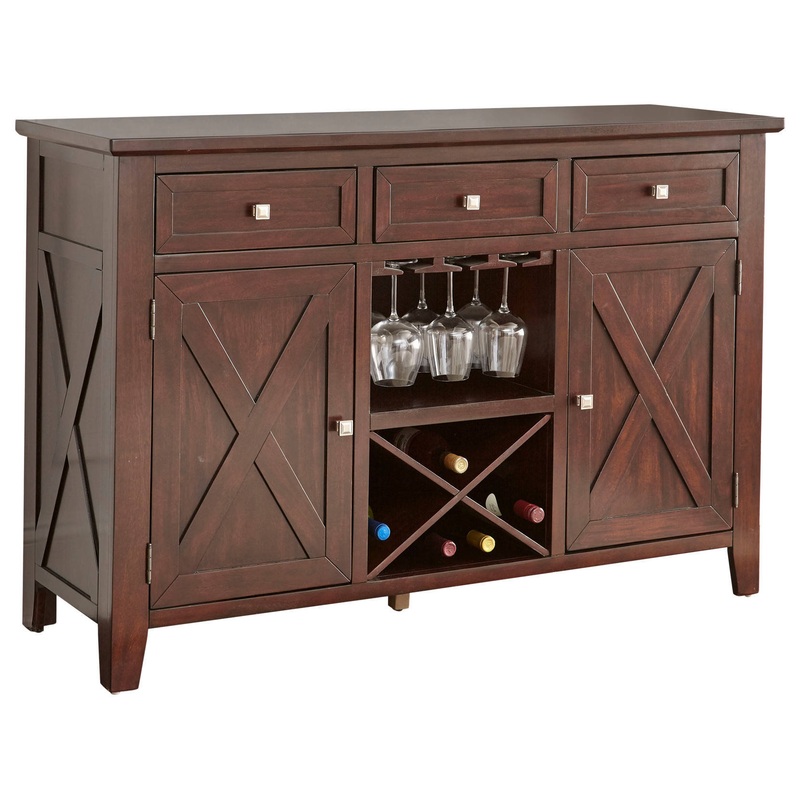 The look of the Adrian Server is unique and modern. The server is crafted of hardwood solids and primavera veneers, and boasts a hand applied espresso cherry finish. Features include 3 drawers, two cabinets with a shelf and stemware storage plus a removable wine rack. The perfect piece for your entertaining needs.