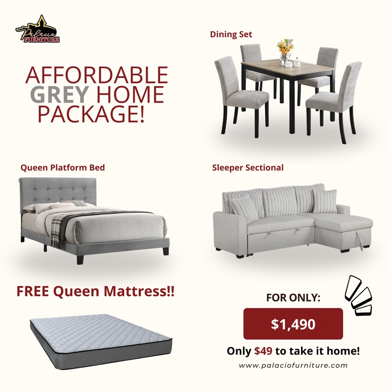 Discover our Affordable Grey Home Package, designed to provide essential furnishings with exceptional value. This package includes a sleek black platform bed paired with a complimentary mattress for immediate comfort, a versatile sleeper sofa ideal for guests, and a stylish dining set that completes your living space. Each piece balances modern design with practicality, ensuring your home is both functional and inviting without compromising your budget. Perfect for those seeking a cohesive look with quality essentials at an expert-approved price point.