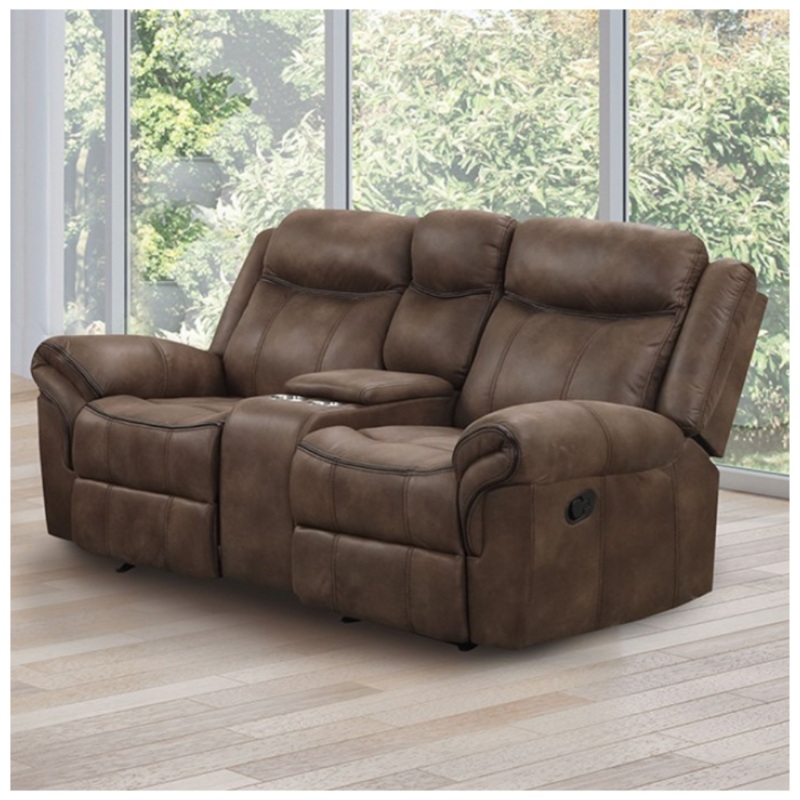 Experience personalized comfort with a smooth-operating glider recliner on both seats, allowing each person to effortlessly recline and enjoy a gentle rocking motion. At the heart of convenience, the built-in storage console and cupholders keep remotes, snacks, and beverages neatly organized and always within reach, ensuring uninterrupted relaxation.
