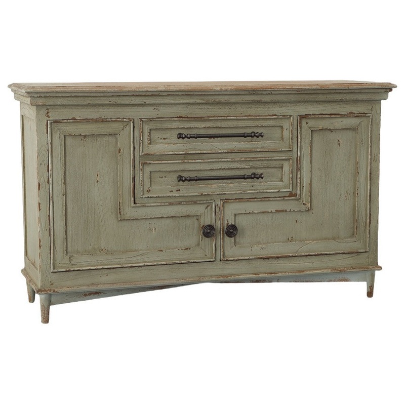 Well, it is a bit wonky, but this eye-catching sideboard is certain to provide an ample serving of design personality to your room! Whatever you need to store, you are likely to find just the right spot, either in the two ample drawers, or behind the uniquely shaped doors. Mahogany construction is enhanced by the application of a hand distressed gray finish, and further embelleshed by handsome black hardware.