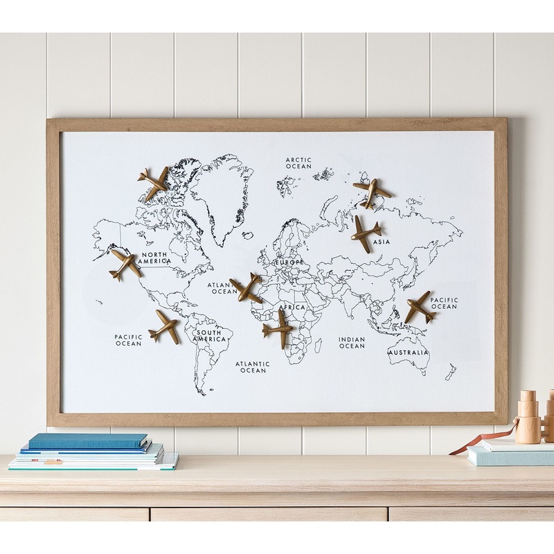 Prepare for big adventures! Keep their high-flying dreams organized on our Airplane Magnet Board. Showcasing a hand-applied world map framed in mango wood, this wall organizer comes with eight airplane magnets to keep everything from school schedules to vacations within reach.DETAILS THAT MATTERExpertly crafted of mango wood and iron.Backing is made of MDF.Frame features a hand-applied, water-based finish in Seadrift.Magnets are made of cast aluminum with an Antique Brass finish.Magnet board is made of linen with a digitally printed design.Can be hung horizontally only.D-Rings for hanging.Made with FSC-certified wood. Your purchase helps support healthy forests and ecosystems worldwide.KEY PRODUCT POINTSPottery Barn Kids exclusive.Some assembly required.Mounting hardware included (ITW anchors and screws).Wipe clean.Imported.