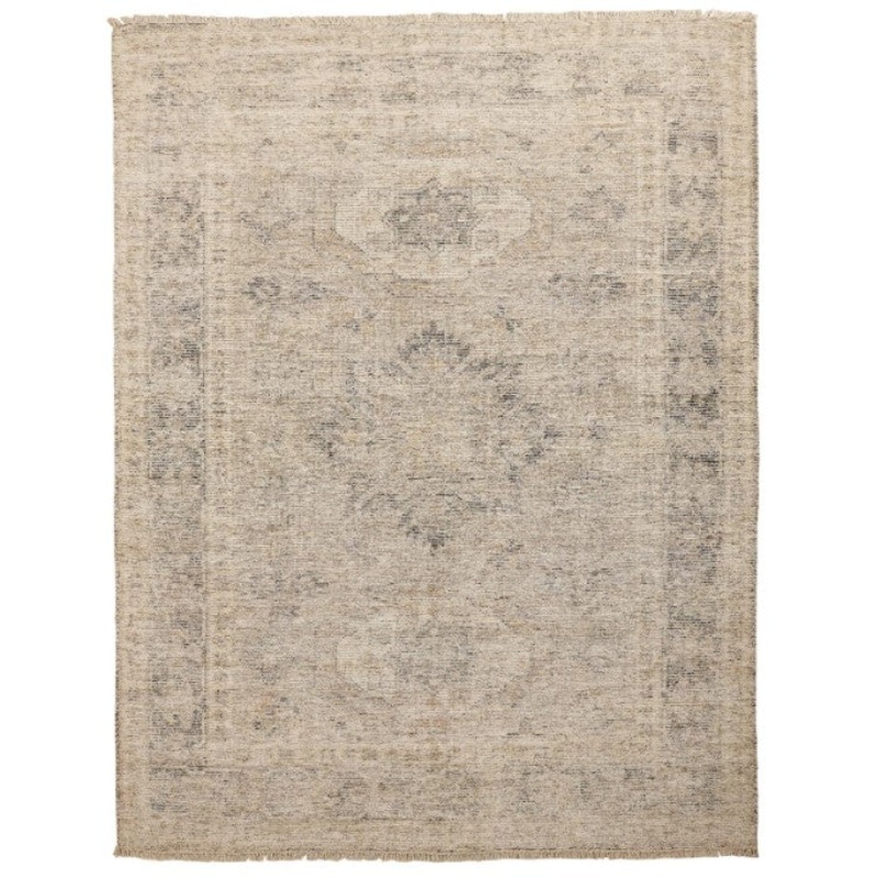 The rustically distressed Persian design elements of the Caldwell Collection bring a subtle elegance through a distressed aesthetic, and neutral palette of ivory sand and denim blue. Using a pointillistic approach to the weaving technique, the Caldwell simultaneously creates and destroys the image of the pattern, which is then emphasized by the space dyed yarns, giving these rugs a heavily distressed texture for a vintage look and feel. Overall, this technique will create a dark to light or light to dark gradation effect based on yarn exposure during the weaving process. Please note that you may receive a rug that represents either the lighter or darker variation.Color: Tan and GrayMaterial: Wool / ViscoseConstruction: Hand WovenAvailable Sizes:2′ x 3’3’6″ x 5’6″5′ x 7’6″7’6″ x 9’6″9′ x 12’10’ x 14’Thickness: 0.4″