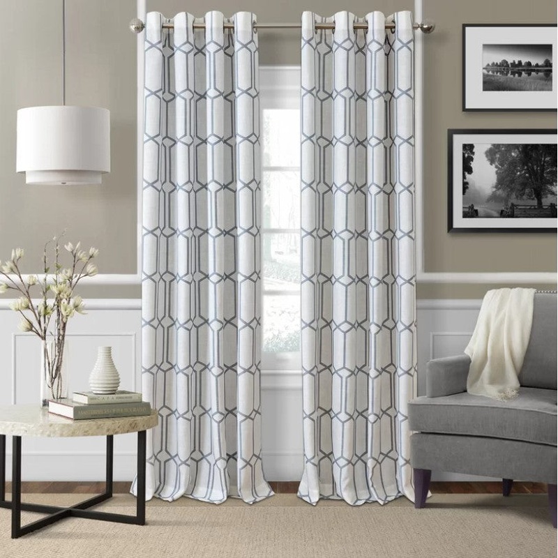Lend a pop of pattern to your living room or master suite with this eye-catching curtain panel. Showcasing a geometric motif, this piece still blends with your existing ensemble thanks to two neutral tones. It offers thermal room darkening benefits that block light from coming in and stabilize the temperature in your ensemble. This curtain features an all-over geometric trellis on a luxurious off-white linen blend ground. *Please note, that the soft blue colorway has a slight grey tone to it.What’s Included?Liner(s)