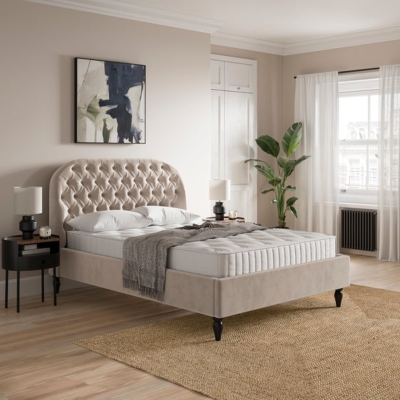 Upholstered bed frameDark wood legsSprung slatted baseThis bed frame brings a touch of opulence and glamour to your bedroom with its luxurious hand-sewn fabric finish and elegant wooden legs. The bed features a stunning curved Chesterfield-style headboard,