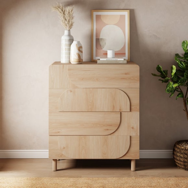 This chest offers four spacious drawers, each equipped with durable metal runners that guarantee smooth operation, making it a reliable and user-friendly storage solution. The fully knock down design is ideal for modern homes, allowing for easy assembly and transportation, which is particularly beneficial if you frequently move or rearrange your space. The light oak finish showcases the wood’s natural beauty, creating a warm and inviting atmosphere in your bedroom.