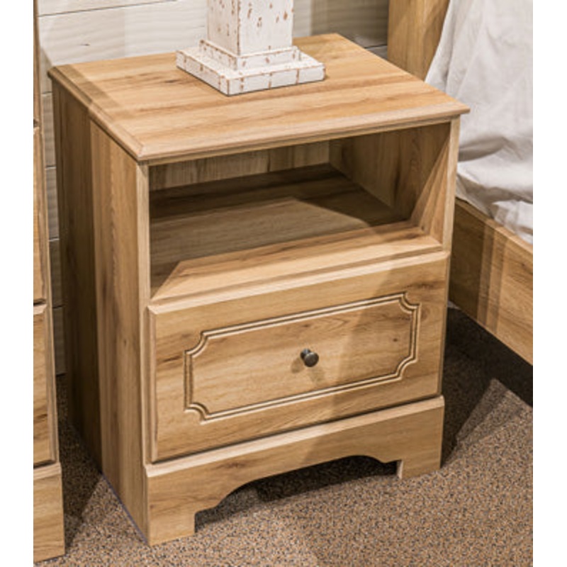 Country rustic. Vintage inspired. However you see it, youre sure to be charmed by this nightstand. Adorned with a chic drawer knob and a warm oak grain finish, it offers a relaxed mix of picturesque aesthetics. Its storage space gracefully welcomes bedside