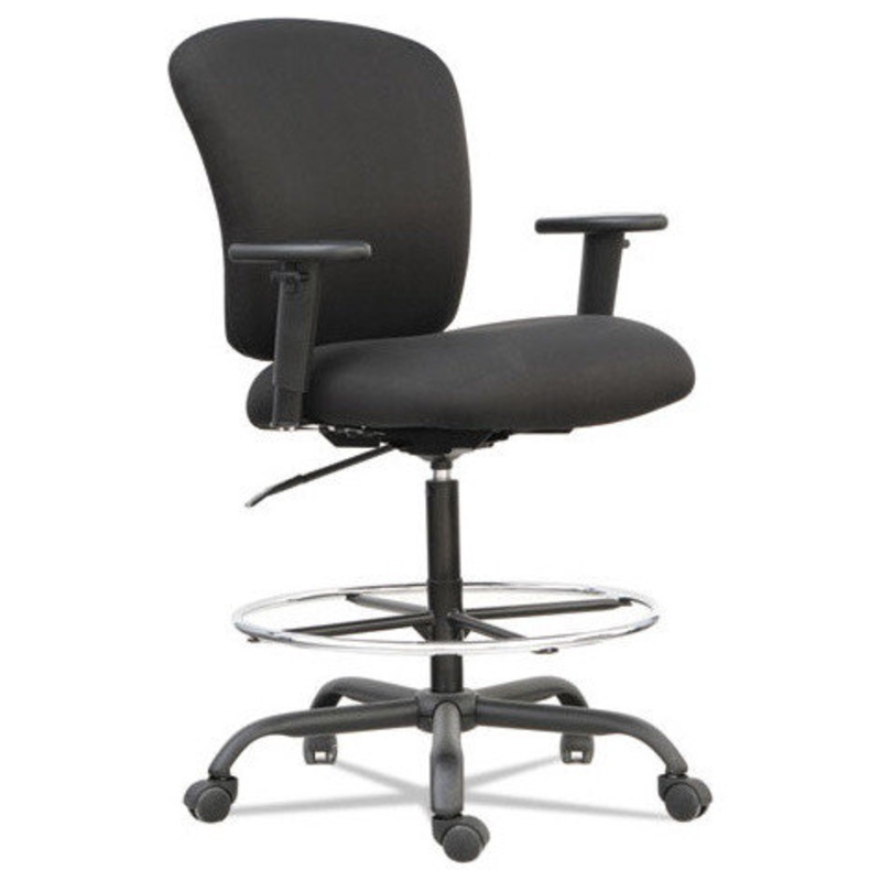 Generously padded contoured seating ideal for the big and tall user. Reinforced seating structure and steel base for maximum reliable support. Enhanced padding and fabrics for extra support all-day long. Welded integrated footring for leg support. Height adjustable soft-padded T-arms for optimal arm positioning. Waterfall seat edge reduces pressure points at the back of the knees.