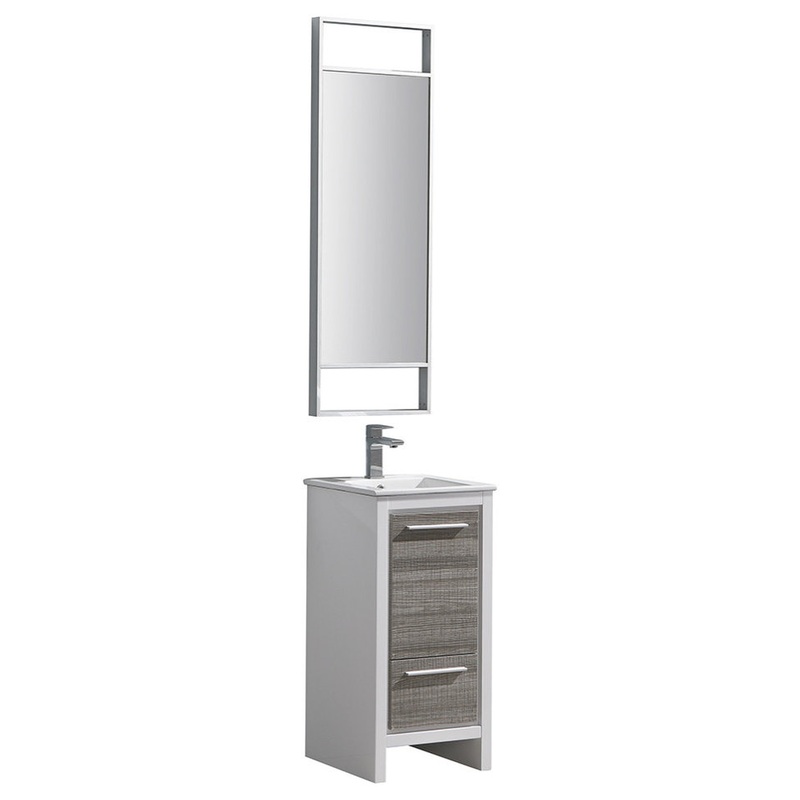 This Fresca Allier Rio model is one of the smallest free standing vanities available. This model is accented nicely with a tall mirror with a ledge for additional storage. Optional side cabinets are available. Many faucet styles to choose from.