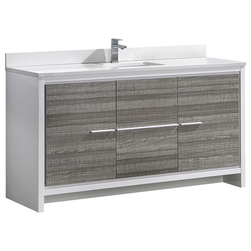 This contemporary single sink bathroom cabinet is a unique combination of casual function and elegant form. Designed to complement any decor scheme, the Fresca Allier Rio Modern Single Sink Bathroom Cabinet features a one piece countertop with an undermount sinks, soft closing doors and handy drawers to hold all of your bathroom essentials. With clean lines and three trendy brushed pulls that align to create the illusion of one single handle, this rectangular cabinet has a lovely Ash Gray finish that adds warmth and elegance to any space. Measuring 60″ in width, this cabinet is the perfect fit for today’s modern bathroom and is available in multiple sizes and finishes.