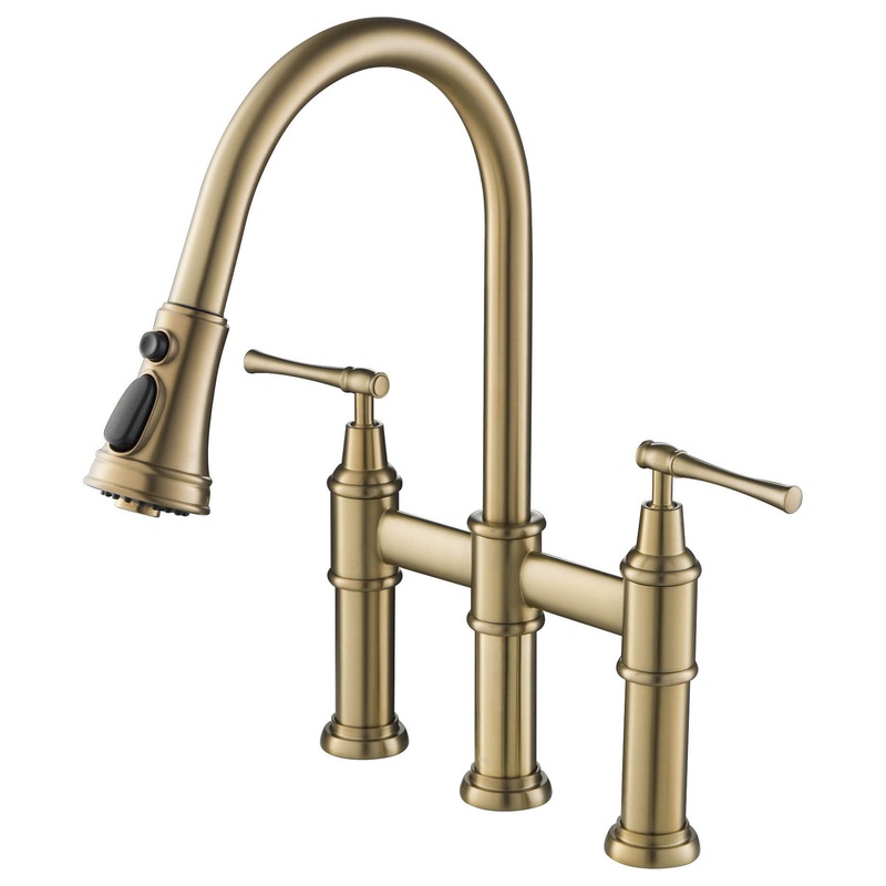 -Allyn Transitional Bridge Kitchen Faucet with Pull-Down Sprayhead in Brushed Gold