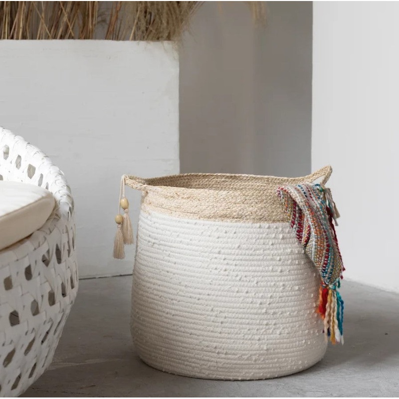 Having a breathable and organized home helps refresh your spirits. Decluttering can be turned into bliss with versatile organizers. Made from natural elastic cotton rope, our baby laundry basket serves as an environmentally safe storage solution. Featuring a unique bulgy shape, our toy storage basket is designed in a harmonious color scheme, enabling it to double as a home decoration and a storage container for your living room, bedroom, bath, and clothes laundry.FeaturesCrafted from natural cotton to make eco-consciousEquipped with 2 comfy handles to make portableSpacious to suit organizing needsPerfect housewarming gift