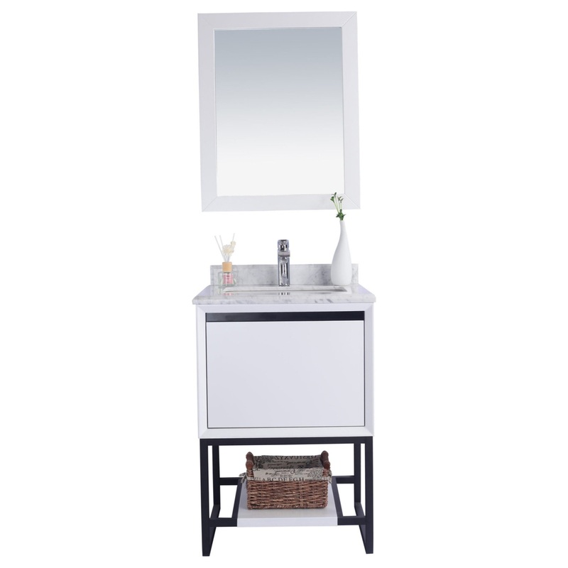 Alto 24 – White Cabinet + White Carrara Marble Countertop313SMR-24W-WC Alto 24 – White Cabinet + White Carrara Marble Countertop, Elevate your space with the Alto Collection! This vanity will bring the New York penthouse vibe to your house. Its straight, simplistic lines and open bottom concept the Alto collection offers elegance with a modernistic approach. The optional open bottom shelf can be removed so the vanity can be both wall mounted or with legs to fit any bathroom design. The matte black, powder coated steel legs and black paint above the drawer offers contrast and sheik style. Additionally, the handless drawer design is embedded within an inner beveled frame. All this is accompanied with soft closing rails, dovetail construction drawers, and solid oak wood frame. Make the Alto collection the statement piece in your bathroom!