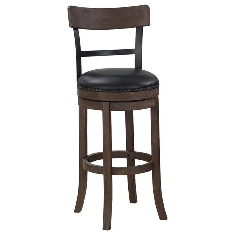 The American Woodcrafters Taranto Tall Bar Stool features a stylish, industrial flare with its charcoal finished steel back design and solid wood cap accent. The washed brown finish and flared legs add style and will easily complement a variety of decors. The black bonded leather seat features a 3-inch seat cushion for comfort and is accented by charcoal finished nail head trim. A 360-degree swivel seat keeps you in the conversation while the circular footrest ensures your comfort. The 34-inch seat height is perfect for your tall bar or counter and will bring a unique transitional style with industrial accent to your space. Your purchase includes one extra tall 34-inch seat height bar stool.