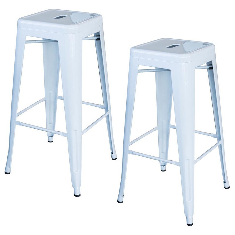 These AmeriHome Metal Bar Stools are durable enough for use in the shop, and stylish enough to use in the kitchen, game room, bar, basement, dorm room, or loft. Ideal for small spaces, the bar stools easily and neatly stack together, making them easy to stash out of the way for storage. A handle in the seat makes the stools easy to pick up and move. Lightweight and sturdy, each stool weighs only 12.5 lbs., but is strong enough to hold up to 330 lbs.Each Metal Bar Stools has a brace under the seat that provides additional support and stability. No-mar rubber feet keep them from sliding and scratching hardwood floors. They bar stools are painted with a scratch-resistant powder coat paint finish. Each Bar Stool stands 30 inches tall with a seat measuring 12 in L x 12 in W. Sold in a set of 2.