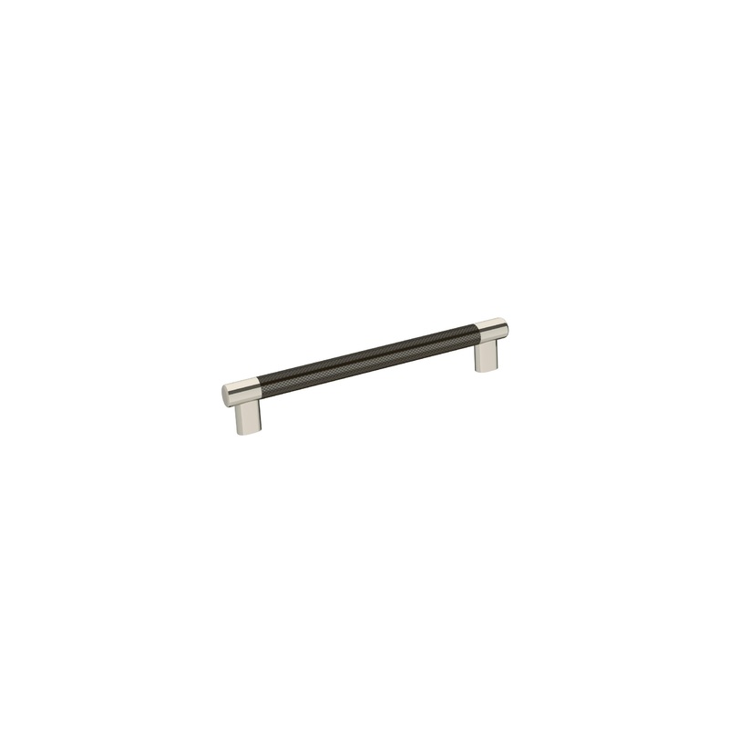 The Amerock BP36562PNGM Esquire 8 in (203 mm) Center-to-Center Pull is finished in Polished Nickel/Gunmetal. Esquire's sophisticated and modern industrial composition pairs an upscale crosshatch texture with smooth complementary metallic ends for cutting-e