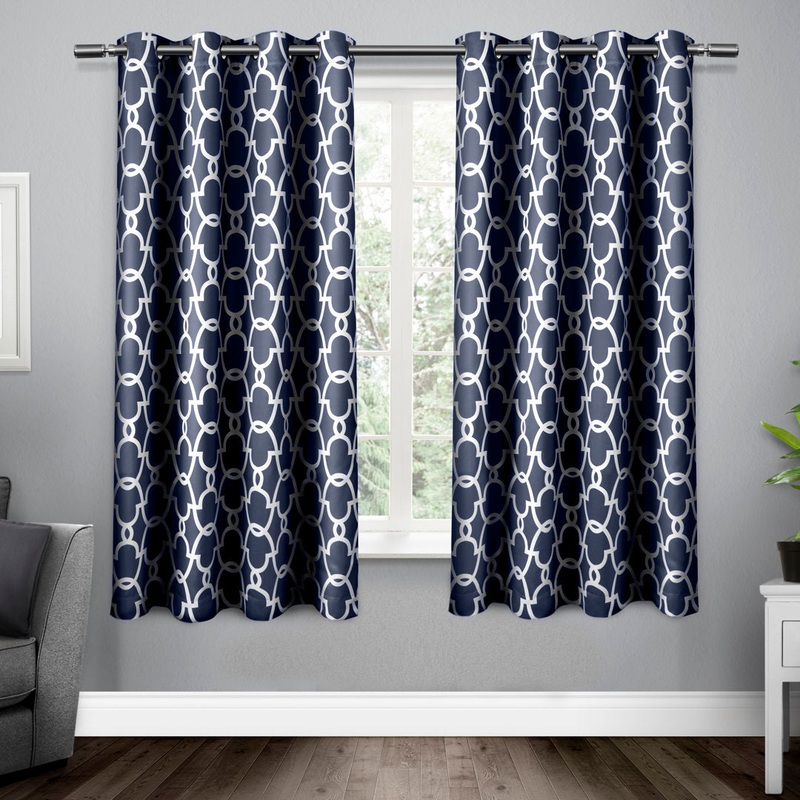 This set of two curtain panels is just what you need to give your home a quick and elegant update. Made from 100% polyester, this set is room-darkening and noise-reducing, so its great for your bedroom or the living room. Each panel features a neutral background and is splashed with an all-over geometric pattern that looks like interlocking ringlets to add a traditional feel to your space. Best of all, this set is easy to clean by hand. A few things to keep in mind: A curtain rod is sold separately and no liners or backing are included. Andover Mills Size per Panel: 52″ W x 63″ L, Curtain Color: Peacoat Blue