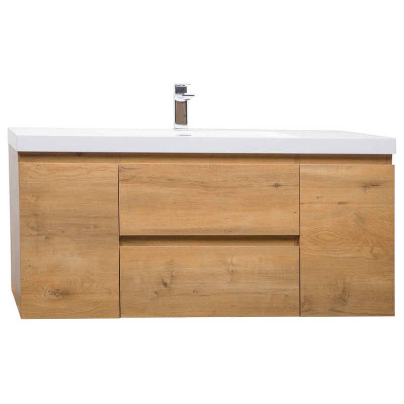 Once considered a niche design feature, handleless bathroom vanities have grown in popularity, fueled by an increasing demand for contemporary styles, minimalist looks and the need to maximize space. Handleless design creates a streamlined flow of bathroom units that’s beautiful as well as efficient. The resulting look is chic, clean and clutter-free. This handless 47″ Angela single vanity features (2) fully functional soft-closing drawers and (2) doors. Yukon faucet and drain assembly in brushed nickel finish included.