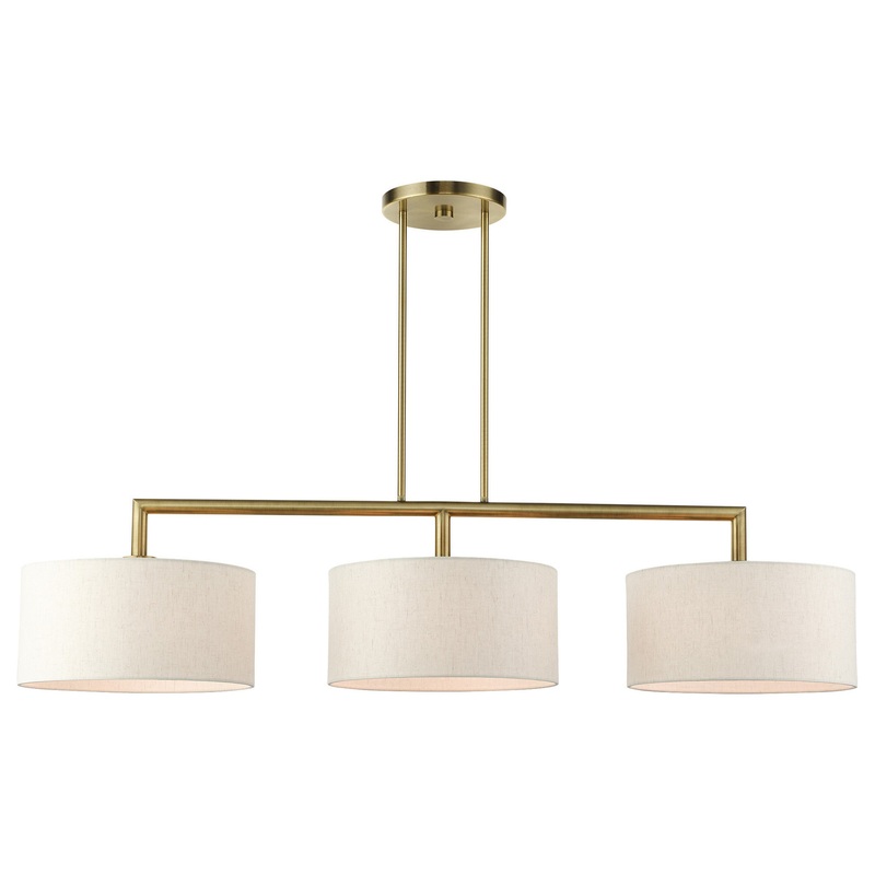 The Meridian collection has a clean, crisp look and contemporary appeal. The hand-crafted oatmeal colored fabric hardback shades offer a diffused warm light. This three-light linear chandelier has a sleek upper frame over the three shades. Will adapt well in the living room, dining room and over the kitchen island tastefully elevating your style. This sleek design is shown in an Antique Brass finish.