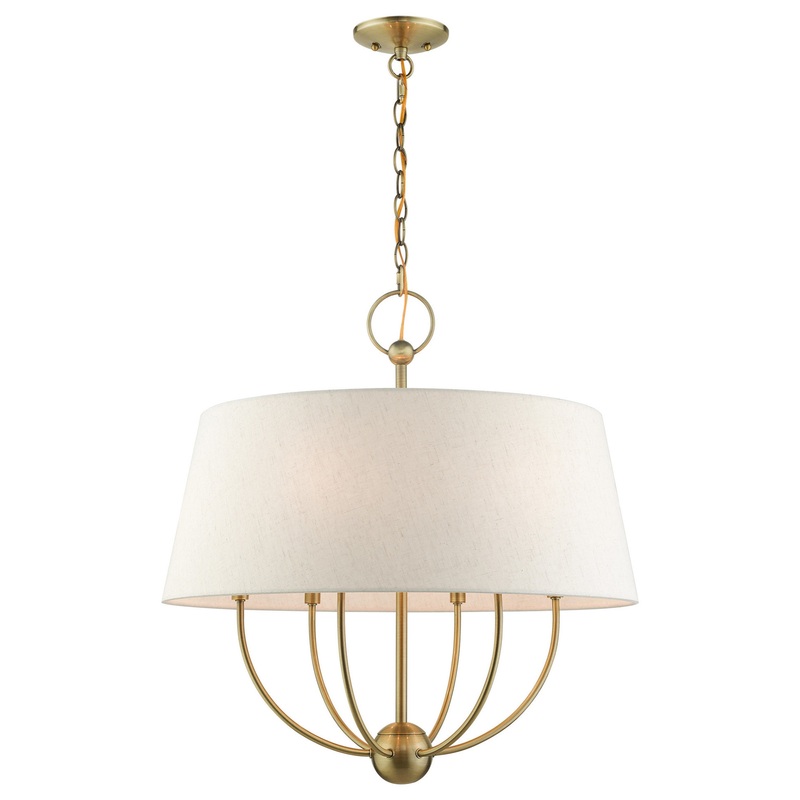 Updated traditional elegance and casual style defines the Cartwright collection. The curvilinear steel frame and accented ball is offset by a hand-crafted oatmeal colored fabric hardback shade. The essence of this collection amplifies todays approach to a transitional style interior. This antique brass finish six-light chandelier will add a rustic and casual flare to your living room, dining room or kitchen.