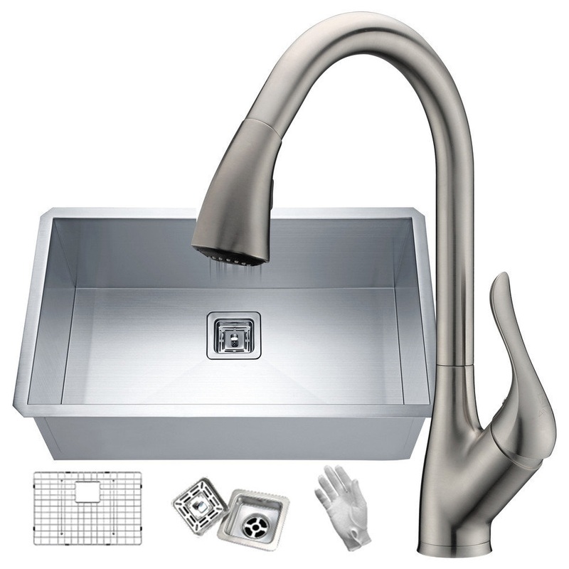 ANZZI presents the 30 inch VANGUARD SERIES hand crafted under mount kitchen sink. Representing the latest in modern home fixture designs and traditional European crafting technique this stunning display of artistry is hand shaped to perfection using RHINO ALLOY certified 16 gauge 304 stainless steel. Only ANZZI hand crafted kitchen sinks utilize RHINO ALLOY certified materials for superior strength and quality. The cavernous deep soaking basin will comfortably accommodate the largest dish loads including pots, pans and more. And every ANZZI sink features the largest Echo-STOP sound dampening pads available and a layer of protective composite coating to further quiet noise and prevent condensation. Well defined diversion lines ensure quick and total water drainage and the subtly curved corners allow of easier cleaning. ANZZI carries a proud tradition of crafting long lasting, quality home fixtures. Included with your kitchen sink is one of our premium faucets. ANZZI is committed to introducing the latest in European bath fixture design to the North American home. ANZZI presents the Accent Series Single Handle Pull Down Kitchen Faucet. Crafted using lead-free RHINO ALLOY certified brass as the interior and our Traditional Brushed Nickel rust resistant finish. With ANZZI perfection is our tradition.