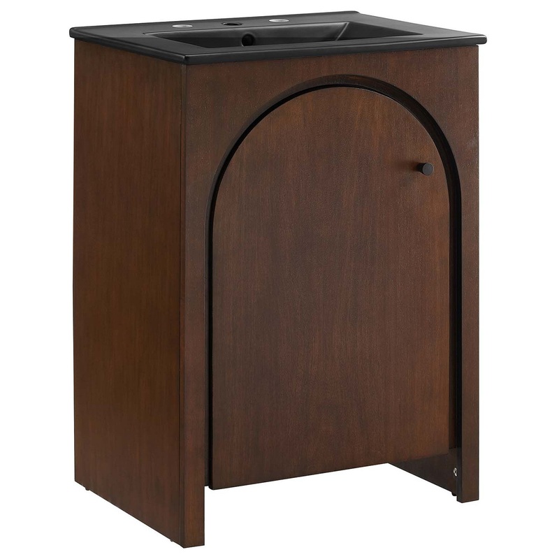 Elevate your bathroom’s style with the Appia 24″ Single Bathroom Vanity, where retro elegance meets functionality. Expertly crafted from high-quality MDF and adorned with a mango wood veneer, this vanity cabinet brings stunning organic aesthetics to your bathroom. Its unique arched door adds beautiful dimension to any primary or guest bathroom. Featuring soft-close hinges, the Appia compact vanity offers a smooth, quiet experience and includes an adjustable shelf with a convenient plumbing cut-out, providing ample storage for all your small space vanity bathroom essentials. With its black ceramic sink basin with 8″ centerset holes and integrated countertop, this sink cabinet easily becomes a functional centerpiece in any bathroom. Assembly is straightforward, ensuring you can enjoy this stylish and modern vanity effortlessly. Includes adjustable non-marking foot pads to protect flooring. Fixtures not included.