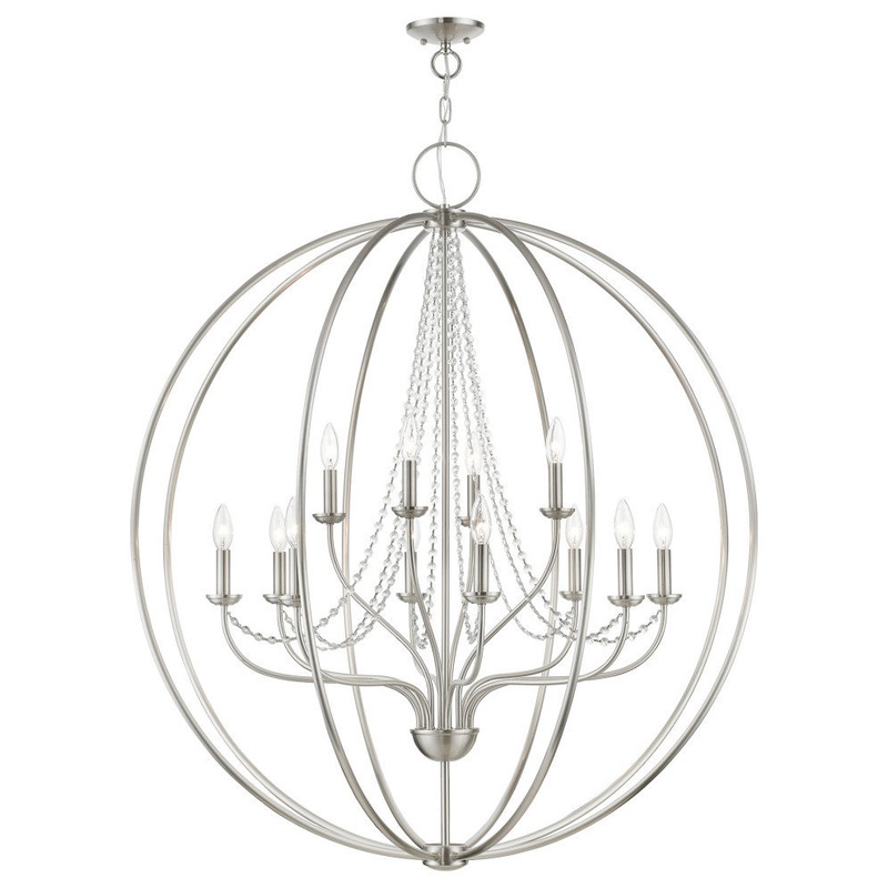 Our Arabella collection twelve light transitional grande orb features a brushed nickel finish and delicate draping crystals. Together, the metal and crystal create a balance between modern and classical. This clever design combination is the model of versa