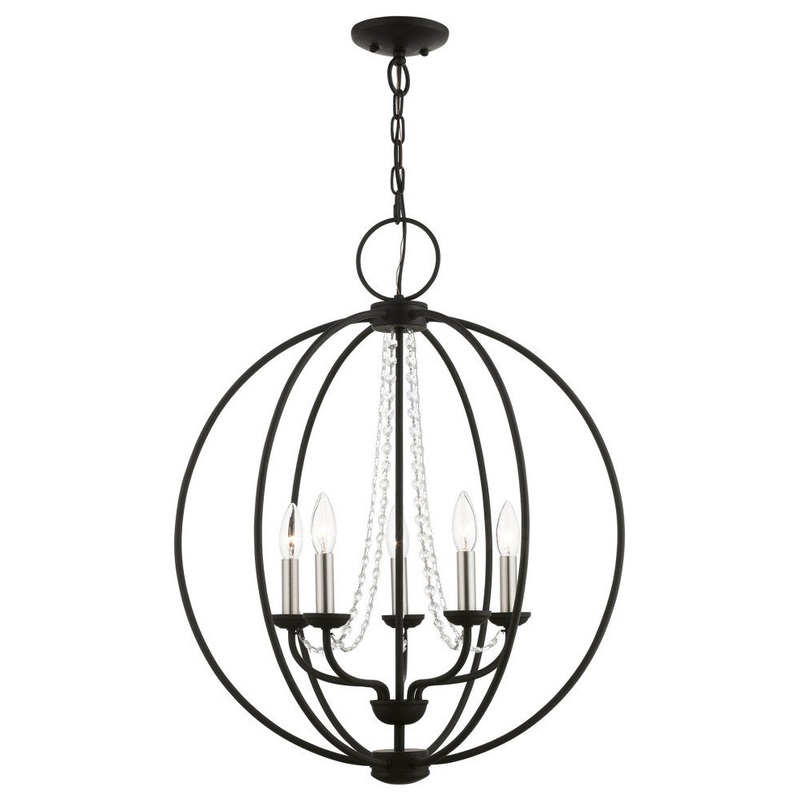 Our Arabella collection five light transitional orb features a black sphere with delicate draping crystals. Together, the metal and crystal create a balance between modern and classical. This clever design combination is the model of versatility and perfec