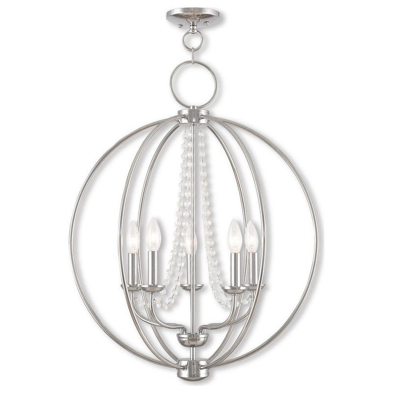 Our Arabella collection five light transitional orb features an polished chrome sphere with delicate draping crystals. Together, the metal and crystal create a balance between modern and classical. This clever design combination is the model of versatility