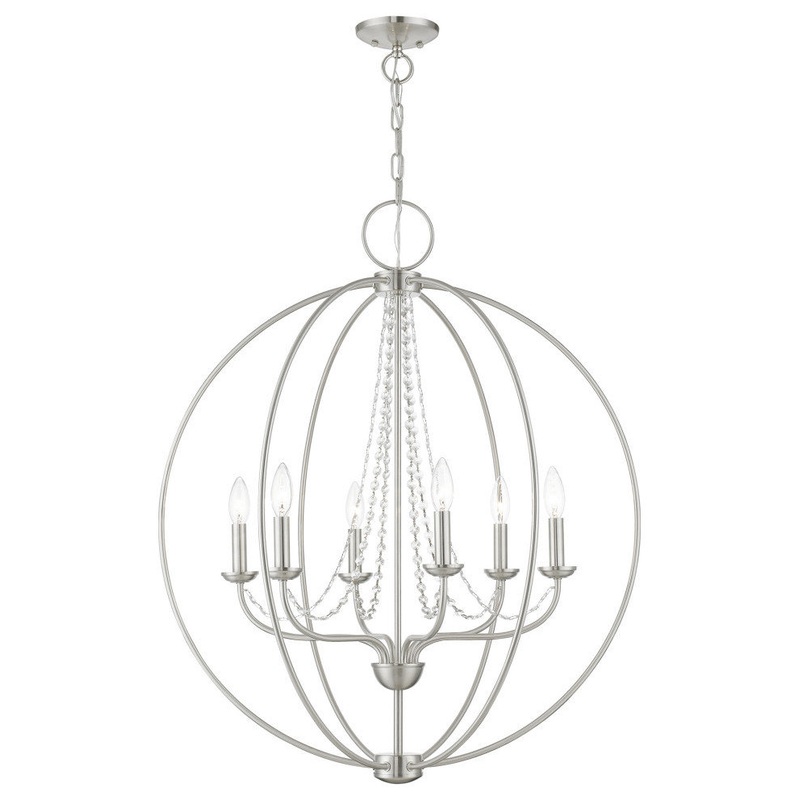 Our Arabella collection six light transitional orb features a brushed nickel finish and delicate draping crystals. Together, the metal and crystal create a balance between modern and classical. This clever design combination is the model of versatility and