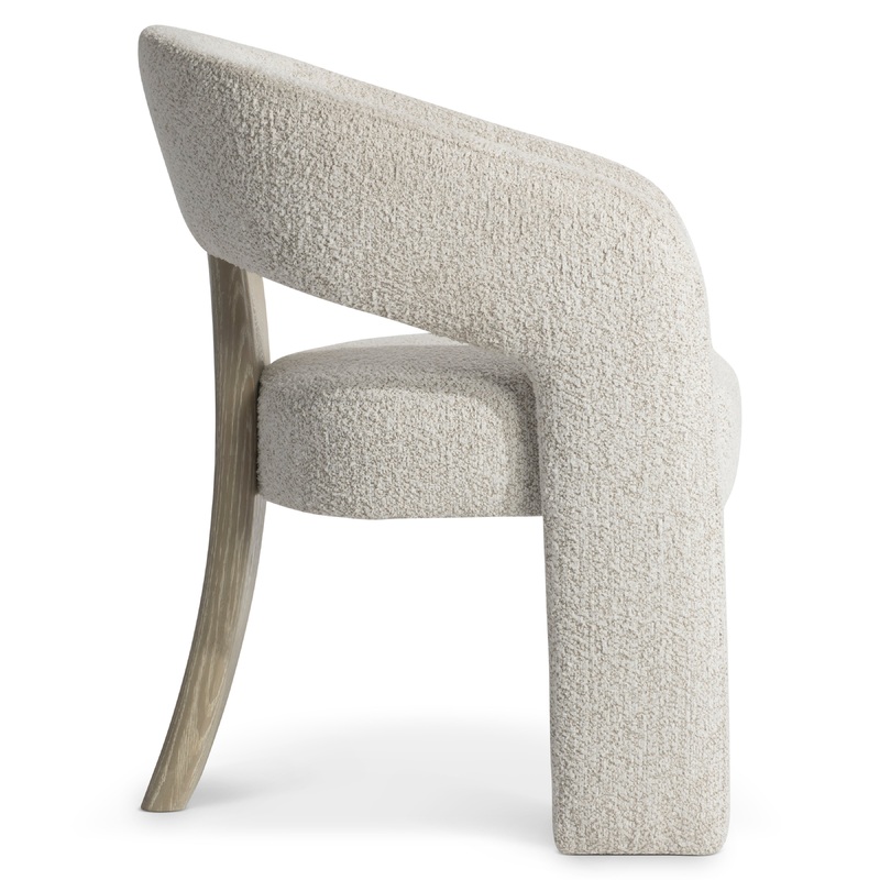 The Arcadia arm chair showcases relaxed, modern style, with an open back that curves around to form the front legs. The seat floats in the center, highlighted by a wood panel in Clay finish that crafts a third leg on the back.