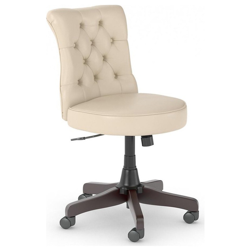 With a stylish design and plenty of colors to choose from, the Bush Business Furniture Arden Lane Mid Back Tufted Office Chair offers a sophisticated seating solution for those with fashionable tastes. Along with its appealing look, this desk chair also includes a variety of features intended to provide exceptional comfort and functionality. The tilt mechanism can be set to a custom rate and ease of recline by turning the tension knob located underneath the seat. A convenient lever adjusts the seat height to meet individual preference and is also used to lock the tilt function in an upright position. Made with heavy duty steel and finished with an Espresso Wood cover, the durable base supports the chair for a weight capacity of 275 pounds. This casual swivel chair is tested to meet ANSI/BIFMA quality standards for safety and performance and is backed by a 5 Year Manufacturer’s Warranty.