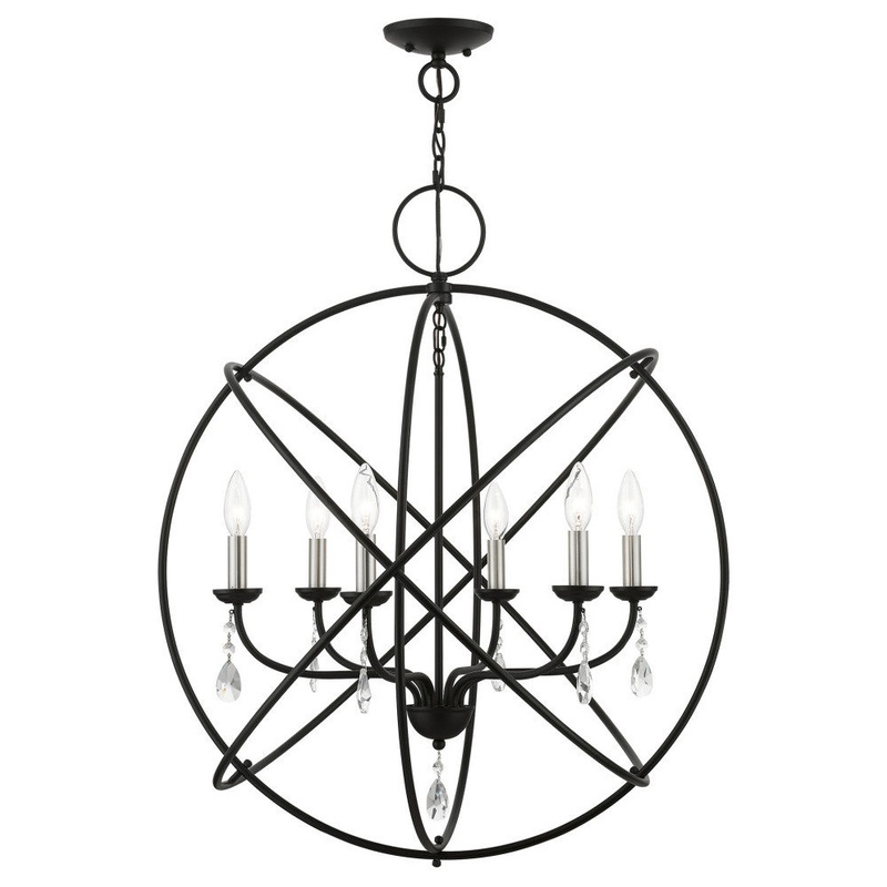 The delicate dangling crystals of the Aria collection adds an eclectic counterpoint to the luxurious orb. The six-arm light cluster nestled within orbiting rings features faceted clear teardrop crystals. This fixture will look fabulous in the dining room, bedroom or in the living room. With its easy installation and low upkeep requirements, this light will not disappoint. It is shown in a black finish with brushed nickel finish candles.
