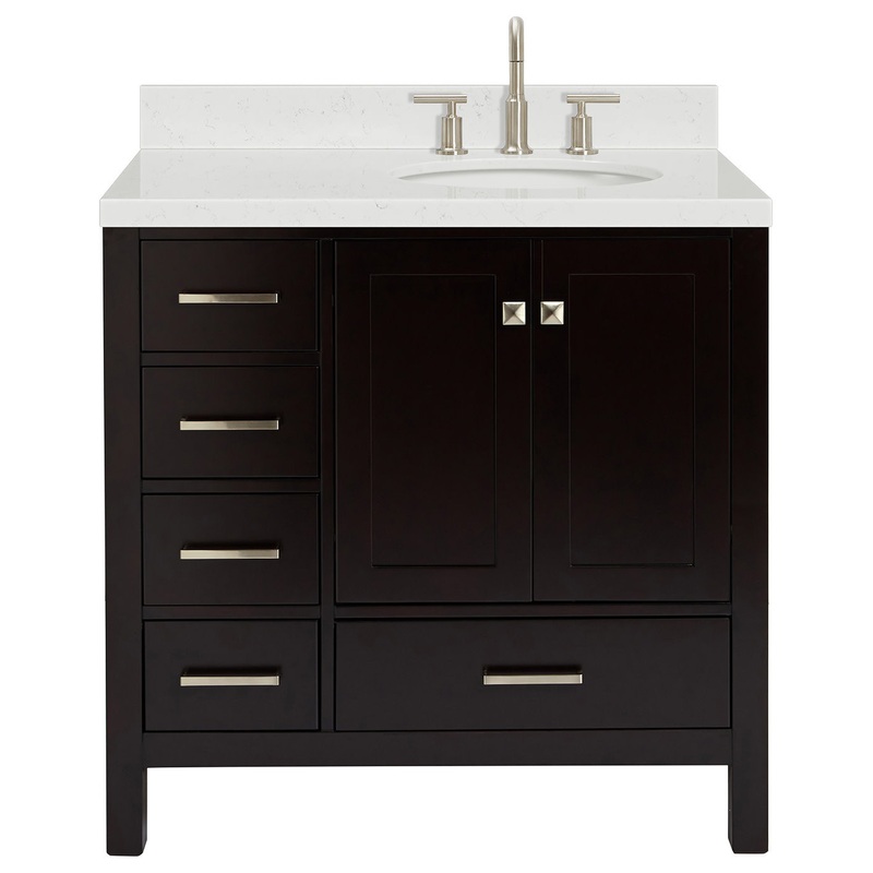 The Cambridge vanity with hardwood frame is the perfect choice for those looking for a contemporary bathroom vanity that will be the center focal point for your updated bathroom. Featuring shaker style doors and flat panel drawers, this bathroom vanity will be sure to highlight any bathroom environment and create a luxurious spa-like experience in anybodys home. Included Components: Covered under Ariel’s 3 year limited warranty Wood vanity cabinet with 2 doors and 5 drawers Quartz vanity top with a single sink and backsplash Faucet is not included and must be purchased separately Cabinet Features: Constructed from wood providing a lifetime of durability Free standing installation – vanity is seated on the floor with wall anchors, providing a functional design Double door design provides easy access to storage space 5 full extension drawers with soft-close slides allows for organized storage Soft close drawer slides operate on smooth ball-bearings and prevent drawers from slamming shut Vanity cabinet includes matching decorative hardware Vanity will need to be assembled Vanity Top Features: Quartz vanity top includes a sink 3 pre-drilled faucet holes Each sink features its own oval single basin workspace Center drain location provides optimal draining capability Equipped with an overflow drain to help prevent spillage Vanity top includes matching backsplash Cabinet Specifications: Cabinet Width: 36″ (left to right) Cabinet Height: 34-1/2″ (top to bottom) Cabinet Depth: 21-1/2″ (front to back) Number of Doors: 2 Number of Drawers: 5 Vanity Top Specifications: Vanity Top Width: 35-1/4″ (left edge to right edge) Vanity Top Depth: 22″ (front edge to back edge) Backsplash Height: 4″ Number of Basins: 1 Sink Dimensions: 8″H x 16″W x 20″L Sink Basin Dimensions: 16-1/4″ L x 13″ W x 7″ D Number of Faucet Holes: 3 Faucet Centers: 8″ (distance between the installation holes for the faucet handles)