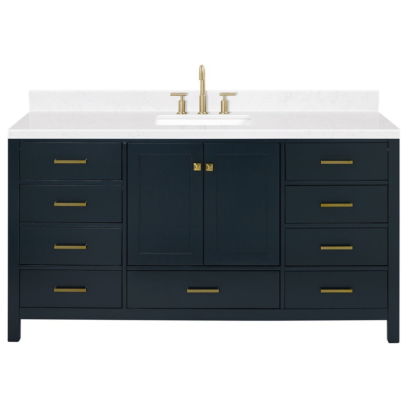 The Cambridge vanity with hardwood frame is the perfect choice for those looking for a contemporary bathroom vanity that will be the center focal point for your updated bathroom. Featuring shaker style doors and flat panel drawers, this bathroom vanity will be sure to highlight any bathroom environment and create a luxurious spa-like experience in anybodys home. Included Components: Covered under Ariel’s 3 year limited warranty Wood vanity cabinet with 2 doors and 9 drawers Quartz vanity top with a single sink and backsplash Faucet is not included and must be purchased separately Cabinet Features: Constructed from wood providing a lifetime of durability Free standing installation – vanity is seated on the floor with wall anchors, providing a functional design Double door design provides easy access to storage space 9 full extension drawers with soft-close slides allows for organized storage Soft close drawer slides operate on smooth ball-bearings and prevent drawers from slamming shut Vanity cabinet includes matching decorative hardware Vanity will need to be assembled Vanity Top Features: Quartz vanity top includes a sink 3 pre-drilled faucet holes Each sink features its own rectangular single basin workspace Center drain location provides optimal draining capability Equipped with an overflow drain to help prevent spillage Vanity top includes matching backsplash Cabinet Specifications: Cabinet Width: 66″ (left to right) Cabinet Height: 34-1/2″ (top to bottom) Cabinet Depth: 21-1/2″ (front to back) Number of Doors: 2 Number of Drawers: 9 Vanity Top Specifications: Vanity Top Width: 66-1/4″ (left edge to right edge) Vanity Top Depth: 22″ (front edge to back edge) Backsplash Height: 4″ Number of Basins: 1 Sink Dimensions: 8″H x 20″W x 15″L Sink Basin Dimensions: 17-1/4″ L x 12″ W x 6-1/2″ D Number of Faucet Holes: 3 Faucet Centers: 8″ (distance between the installation holes for the faucet handles)