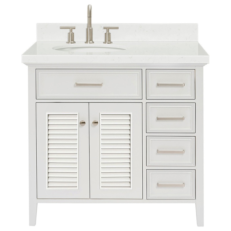 The Kensington bathroom vanity features a hardwood cabinet with louver style doors that would be the perfect fit for a beach or coastal decor themed home. Included Components: Covered under Ariel’s 3 year limited warranty Wood vanity cabinet with 2 doors and 4 drawers Quartz vanity top with a single sink and backsplash Faucet is not included and must be purchased separately Cabinet Features: Constructed from wood providing a lifetime of durability Free standing installation – vanity is seated on the floor with wall anchors, providing a functional design Double door design provides easy access to storage space 4 full extension drawers with soft-close slides allows for organized storage Soft close drawer slides operate on smooth ball-bearings and prevent drawers from slamming shut Vanity cabinet includes matching decorative hardware Vanity will need to be assembled Vanity Top Features: Quartz vanity top includes a sink 3 pre-drilled faucet holes Each sink features its own oval single basin workspace Center drain location provides optimal draining capability Equipped with an overflow drain to help prevent spillage Vanity top includes matching backsplash Cabinet Specifications: Cabinet Width: 36″ (left to right) Cabinet Height: 34-1/2″ (top to bottom) Cabinet Depth: 21-1/2″ (front to back) Number of Doors: 2 Number of Drawers: 4 Vanity Top Specifications: Vanity Top Width: 35-1/4″ (left edge to right edge) Vanity Top Depth: 22″ (front edge to back edge) Backsplash Height: 4″ Number of Basins: 1 Sink Dimensions: 8″H x 19-5/8″W x 16″L Sink Basin Dimensions: 14-1/8″ L x 18″ W x 7″ D Number of Faucet Holes: 3 Faucet Centers: 8″ (distance between the installation holes for the faucet handles)