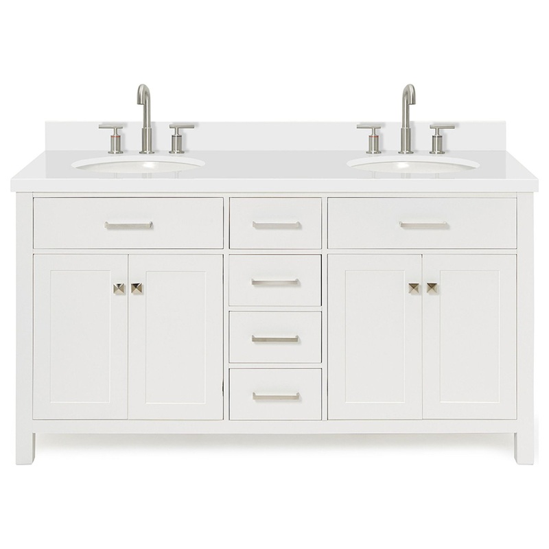 Elegance and simplicity keynote the versatile Bristol collection. Clean lines and square shapes are accented by the modern handles that make the Bristol collection a perfect choice for your bathroom decor. Included Components: Covered under Ariel’s 3 year limited warranty Solid wood and engineered wood vanity cabinet with 4 doors and 4 drawers Quartz vanity top with two sinks and backsplash Faucet is not included and must be purchased separately Cabinet Features: Constructed from solid wood and engineered wood providing a lifetime of durability Free standing installation – vanity is seated on the floor with wall anchors, providing a functional design 4 door design provides easy access to storage space 4 full extension drawers with soft-close slides allows for organized storage Soft close drawer slides operate on smooth ball-bearings and prevent drawers from slamming shut Vanity cabinet includes matching decorative hardware Vanity will need to be assembled Vanity Top Features: Quartz vanity top includes undermount sinks 3 pre-drilled faucet holes per basin Each sink features its own oval single basin workspace Center drain location provides optimal draining capability Sink does not include an overflow Vanity top includes matching backsplash Cabinet Specifications: Cabinet Width: 60″ (left to right) Cabinet Height: 34-1/2″ (top to bottom) Cabinet Depth: 21-1/2″ (front to back) Number of Doors: 4 Number of Drawers: 4 Vanity Top Specifications: Vanity Top Width: 61″ (left edge to right edge) Vanity Top Depth: 22″ (front edge to back edge) Backsplash Height: 4″ Number of Basins: 2 Sink Dimensions: 8-1/4″H x 16″W x 19-5/8″L Sink Cutout Length: 16-1/4″ (left to right) Sink Cutout Width: 13″ (front to back) Sink Basin Dimensions: 17-3/4″L x 14-1/8″W x 7″D Number of Faucet Holes: 3 Faucet Centers: 8″ (distance between the installation holes for the faucet handles)