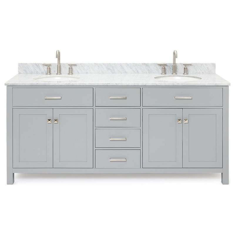 Elegance and simplicity keynote the versatile Bristol collection. Clean lines and square shapes are accented by the modern handles that make the Bristol collection a perfect choice for your bathroom decor. Included Components: Covered under Ariel’s 3 year limited warranty Solid wood and engineered wood vanity cabinet with 4 doors and 4 drawers Carrara Marble vanity top with two sinks and backsplash Faucet is not included and must be purchased separately Cabinet Features: Constructed from solid wood and engineered wood providing a lifetime of durability Free standing installation – vanity is seated on the floor with wall anchors, providing a functional design 4 door design provides easy access to storage space 4 full extension drawers with soft-close slides allows for organized storage Soft close drawer slides operate on smooth ball-bearings and prevent drawers from slamming shut Vanity cabinet includes matching decorative hardware Vanity will need to be assembled Vanity Top Features: Marble vanity top includes undermount sinks 3 pre-drilled faucet holes per basin Each sink features its own oval single basin workspace Center drain location provides optimal draining capability Sink does not include an overflow Vanity top includes matching backsplash Cabinet Specifications: Cabinet Width: 72″ (left to right) Cabinet Height: 34-1/2″ (top to bottom) Cabinet Depth: 21-1/2″ (front to back) Number of Doors: 4 Number of Drawers: 4 Vanity Top Specifications: Vanity Top Width: 73″ (left edge to right edge) Vanity Top Depth: 22″ (front edge to back edge) Backsplash Height: 4″ Number of Basins: 2 Sink Dimensions: 8-1/4″H x 16″W x 19-5/8″L Sink Cutout Length: 16-1/4″ (left to right) Sink Cutout Width: 13″ (front to back) Sink Basin Dimensions: 17-3/4″L x 14-1/8″W x 7″D Number of Faucet Holes: 3 Faucet Centers: 8″ (distance between the installation holes for the faucet handles)