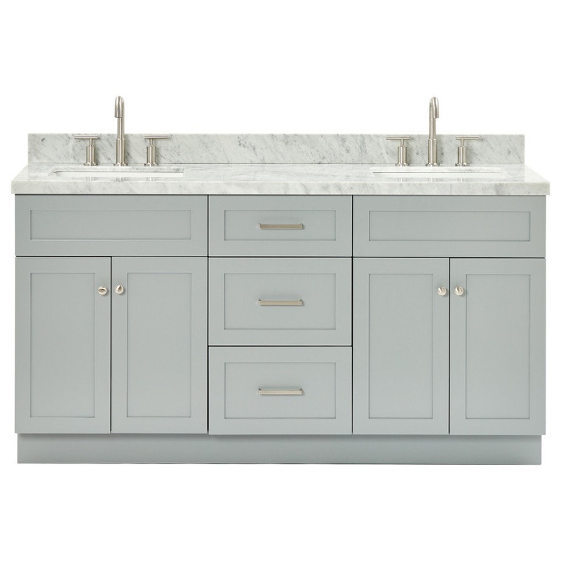 The Hamlet series offers granite or quartz countertops mounted above solid wood cabinets. With brushed nickel finish hardware on the drawers and cabinet doors, these vanity sets will add an elegant aesthetic to a bathroom remodel. -Covered under Ariel's 3
