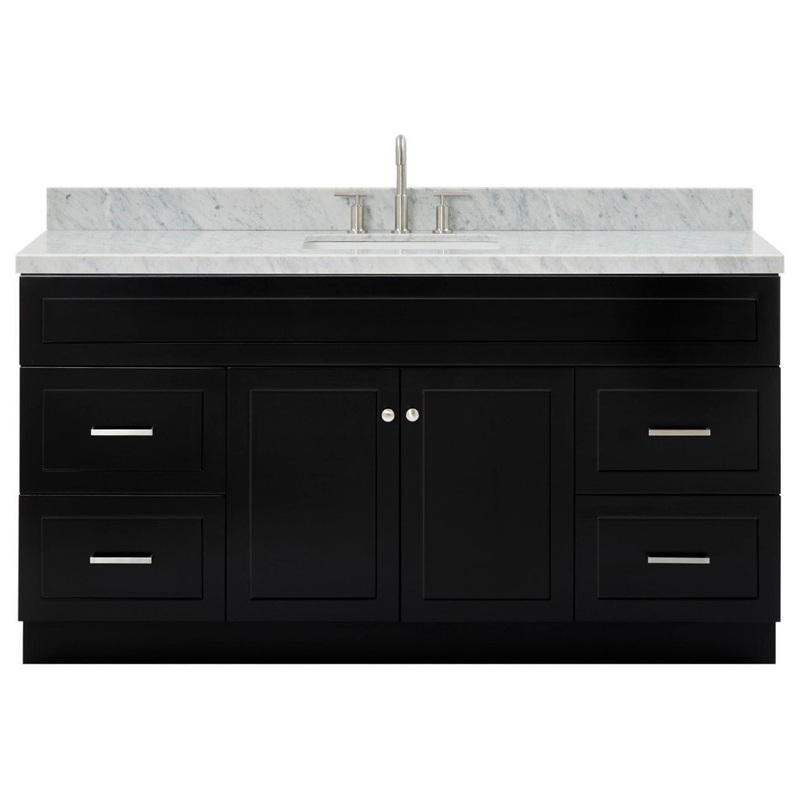 The Hamlet series offers granite or quartz countertops mounted above solid wood cabinets. With brushed nickel finish hardware on the drawers and cabinet doors, these vanity sets will add an elegant aesthetic to a bathroom remodel. -Covered under Ariel's 3