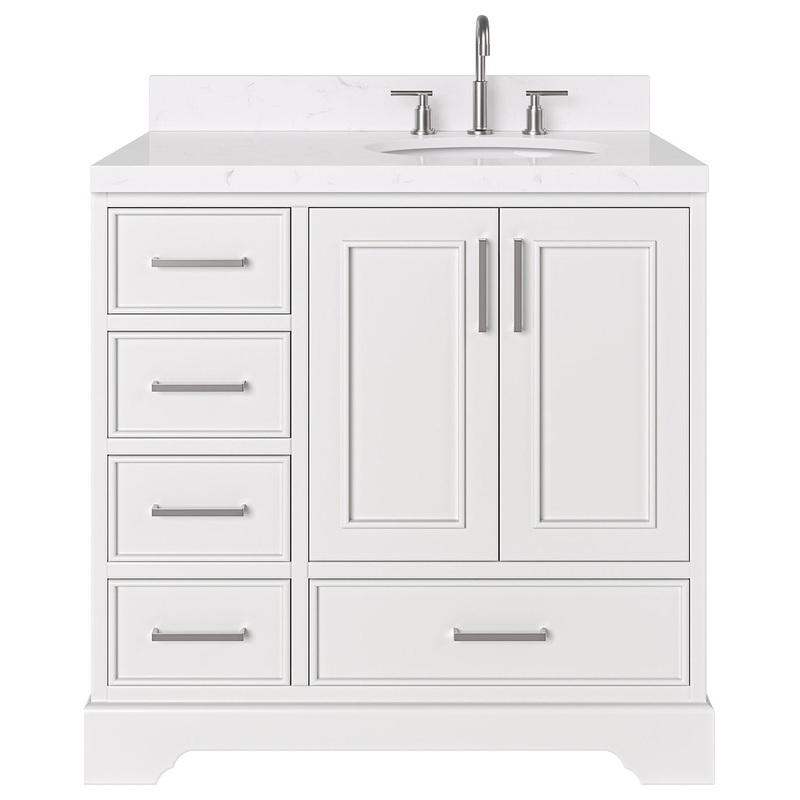 The Stafford bathroom vanity makes bathroom storage look glamorous with this statement piece. Sturdy with a hardwood frame, this vanity is sure to last and stand the test of time. Ample storage space, including a cabinet and dovetail drawers, ensures functionality, this stunning vanity is the perfect upgrade for your bathroom. Included Components: Covered under Ariel’s 3 year limited warranty Wood vanity cabinet with 2 doors and 5 drawers Quartz vanity top with a single sink and backsplash Faucet is not included and must be purchased separately Cabinet Features: Constructed from wood providing a lifetime of durability Free standing installation – vanity is seated on the floor with wall anchors, providing a functional design Double door design provides easy access to storage space 5 full extension drawers with soft-close slides allows for organized storage Soft close drawer slides operate on smooth ball-bearings and prevent drawers from slamming shut Vanity cabinet includes matching decorative hardware Vanity will need to be assembled Vanity Top Features: Quartz vanity top includes a sink 3 pre-drilled faucet holes Each sink features its own oval single basin workspace Center drain location provides optimal draining capability Equipped with an overflow drain to help prevent spillage Vanity top includes matching backsplash Cabinet Specifications: Cabinet Width: 36″ (left to right) Cabinet Height: 34-1/2″ (top to bottom) Cabinet Depth: 21-1/2″ (front to back) Number of Doors: 2 Number of Drawers: 5 Vanity Top Specifications: Vanity Top Width: 35-1/4″ (left edge to right edge) Vanity Top Depth: 22″ (front edge to back edge) Backsplash Height: 4″ Number of Basins: 1 Sink Dimensions: 8″H x 16″W x 20″L Sink Basin Dimensions: 18″ L x 14-1/8″ W x 7″ D Number of Faucet Holes: 3 Faucet Centers: 8″ (distance between the installation holes for the faucet handles)