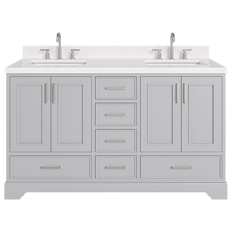 The Stafford bathroom vanity makes bathroom storage look glamorous with this statement piece. Sturdy with a hardwood frame, this vanity is sure to last and stand the test of time. Ample storage space, including a cabinet and dovetail drawers, ensures functionality, this stunning vanity is the perfect upgrade for your bathroom. Included Components: Covered under Ariel’s 3 year limited warranty Wood vanity cabinet with 4 doors and 6 drawers Quartz vanity top with two sinks and backsplash Faucet is not included and must be purchased separately Cabinet Features: Constructed from wood providing a lifetime of durability Free standing installation – vanity is seated on the floor with wall anchors, providing a functional design 4 door design provides easy access to storage space 6 full extension drawers with soft-close slides allows for organized storage Soft close drawer slides operate on smooth ball-bearings and prevent drawers from slamming shut Vanity cabinet includes matching decorative hardware Vanity will need to be assembled Vanity Top Features: Quartz vanity top includes sinks 3 pre-drilled faucet holes per basin Each sink features its own rectangular single basin workspace Center drain location provides optimal draining capability Equipped with an overflow drain to help prevent spillage Vanity top includes matching backsplash Cabinet Specifications: Cabinet Width: 60″ (left to right) Cabinet Height: 34-1/2″ (top to bottom) Cabinet Depth: 21-1/2″ (front to back) Number of Doors: 4 Number of Drawers: 6 Vanity Top Specifications: Vanity Top Width: 60-1/4″ (left edge to right edge) Vanity Top Depth: 22″ (front edge to back edge) Backsplash Height: 4″ Number of Basins: 2 Sink Dimensions: 8″H x 15″W x 20″L Sink Basin Dimensions: 18-1/4″ L x 13″ W x 6-1/2″ D Number of Faucet Holes: 3 Faucet Centers: 8″ (distance between the installation holes for the faucet handles)