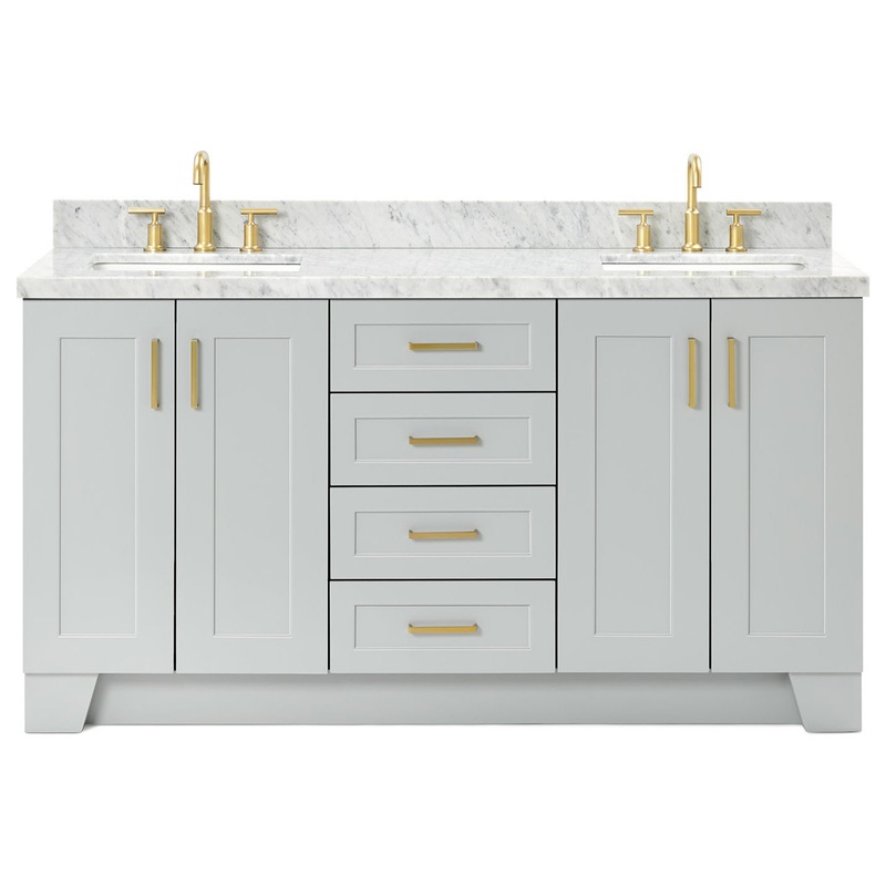 The Taylor vanity collection by ARIEL Bath is the perfect addition of style and flare for any bathroom while still remaining a truly timeless design. Featuring a hidden pull-out drawer behind each pair of cabinet doors, the Taylor vanity is truly the ideal combination of function and form. Available with multiple hardware color and cabinet finish options, you can be sure youll find your perfect match with the ARIEL Taylor vanity collection. Included Components: Covered under Ariel’s 3 year limited warranty Wood vanity cabinet with 4 doors and 4 drawers Carrara White Marble countertop with 1.5 in. edge and matching backsplash Faucet is not included and must be purchased separately Cabinet Features: Hardwood plywood construction for lasting beauty and durability Free standing installation – vanity is seated on the floor with wall anchors, providing a functional design Four soft-closing doors with adjustable hinges so you’ll never have to worry about hearing a door slam Four Full-Extension, Dove-Tail Construction, Soft-Closing Drawers Soft close drawer slides operate on smooth ball-bearings and prevent drawers from slamming shut Dovetail construction drawer boxes for additional strength and durability Vanity will need to be assembled Vanity Top Features: Marble vanity top includes sinks 6 pre-drilled faucet holes per basin Each sink features its own rectangular single basin workspace Center drain location provides optimal draining capability Equipped with an overflow drain to help prevent spillage Vanity top includes matching backsplash Cabinet Specifications: Cabinet Width: 66″ (left to right) Cabinet Height: 34-1/2″ (top to bottom) Cabinet Depth: 21-3/5″ (front to back) Number of Doors: 4 Number of Drawers: 4 Vanity Top Specifications: Vanity Top Width: 67″ (left edge to right edge) Vanity Top Depth: 22″ (front edge to back edge) Backsplash Height: 4″ Number of Basins: 2 Sink Dimensions: 7-1/2″H x 15-1/8″W x 20-1/4″L Sink Basin Dimensions: 18-5/16″ L x 13″ W x 6-1/2″ D Number of Faucet Holes: 6 Faucet Centers: 8″ (distance between the installation holes for the faucet handles)