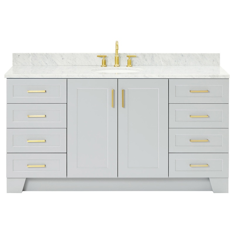The Taylor vanity collection by ARIEL Bath is the perfect addition of style and flare for any bathroom while still remaining a truly timeless design. Featuring a hidden pull-out drawer behind each pair of cabinet doors, the Taylor vanity is truly the ideal combination of function and form. Available with multiple hardware color and cabinet finish options, you can be sure youll find your perfect match with the ARIEL Taylor vanity collection. Included Components: Covered under Ariel’s 3 year limited warranty Wood vanity cabinet with 2 doors and 8 drawers Carrara White Marble countertop with 1.5 in. edge and matching backsplash Faucet is not included and must be purchased separately Cabinet Features: Hardwood plywood construction for lasting beauty and durability Free standing installation – vanity is seated on the floor with wall anchors, providing a functional design Two soft-closing doors with adjustable hinges so you’ll never have to worry about hearing a door slam Eight Full-Extension, Dove-Tail Construction, Soft-Closing Drawers Soft close drawer slides operate on smooth ball-bearings and prevent drawers from slamming shut Dovetail construction drawer boxes for additional strength and durability Vanity will need to be assembled Vanity Top Features: Marble vanity top includes a sink 3 pre-drilled faucet holes Each sink features its own oval single basin workspace Center drain location provides optimal draining capability Equipped with an overflow drain to help prevent spillage Vanity top includes matching backsplash Cabinet Specifications: Cabinet Width: 66″ (left to right) Cabinet Height: 34-1/2″ (top to bottom) Cabinet Depth: 21-3/5″ (front to back) Number of Doors: 2 Number of Drawers: 8 Vanity Top Specifications: Vanity Top Width: 67″ (left edge to right edge) Vanity Top Depth: 22″ (front edge to back edge) Backsplash Height: 4″ Number of Basins: 1 Sink Dimensions: 8-1/4″H x 16″W x 19-5/8″L Sink Basin Dimensions: 17-13/16″ L x 14-1/8″ W x 7″ D Number of Faucet Holes: 3 Faucet Centers: 8″ (distance between the installation holes for the faucet handles)