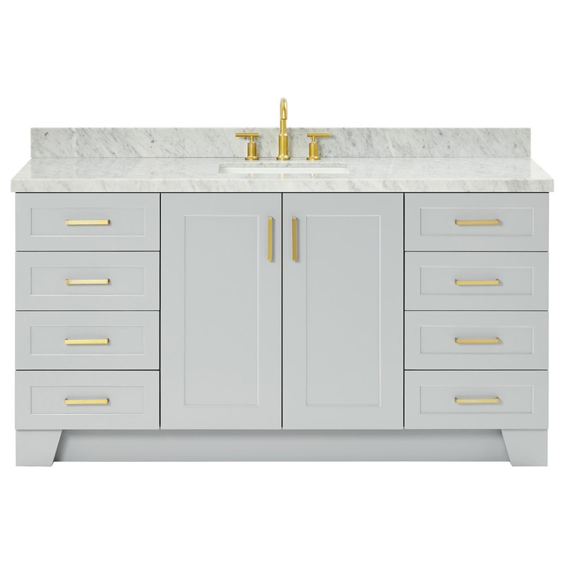 The Taylor vanity collection by ARIEL Bath is the perfect addition of style and flare for any bathroom while still remaining a truly timeless design. Featuring a hidden pull-out drawer behind each pair of cabinet doors, the Taylor vanity is truly the ideal combination of function and form. Available with multiple hardware color and cabinet finish options, you can be sure youll find your perfect match with the ARIEL Taylor vanity collection. Included Components: Covered under Ariel’s 3 year limited warranty Wood vanity cabinet with 2 doors and 8 drawers Carrara White Marble countertop with 1.5 in. edge and matching backsplash Faucet is not included and must be purchased separately Cabinet Features: Hardwood plywood construction for lasting beauty and durability Free standing installation – vanity is seated on the floor with wall anchors, providing a functional design Two soft-closing doors with adjustable hinges so you’ll never have to worry about hearing a door slam Eight Full-Extension, Dove-Tail Construction, Soft-Closing Drawers Soft close drawer slides operate on smooth ball-bearings and prevent drawers from slamming shut Dovetail construction drawer boxes for additional strength and durability Vanity will need to be assembled Vanity Top Features: Marble vanity top includes a sink 3 pre-drilled faucet holes Each sink features its own rectangular single basin workspace Center drain location provides optimal draining capability Equipped with an overflow drain to help prevent spillage Vanity top includes matching backsplash Cabinet Specifications: Cabinet Width: 66″ (left to right) Cabinet Height: 34-1/2″ (top to bottom) Cabinet Depth: 21-3/5″ (front to back) Number of Doors: 2 Number of Drawers: 8 Vanity Top Specifications: Vanity Top Width: 67″ (left edge to right edge) Vanity Top Depth: 22″ (front edge to back edge) Backsplash Height: 4″ Number of Basins: 1 Sink Dimensions: 7-1/2″H x 15-1/8″W x 20-1/4″L Sink Basin Dimensions: 18-5/16″ L x 13″ W x 6-1/2″ D Number of Faucet Holes: 3 Faucet Centers: 8″ (distance between the installation holes for the faucet handles)