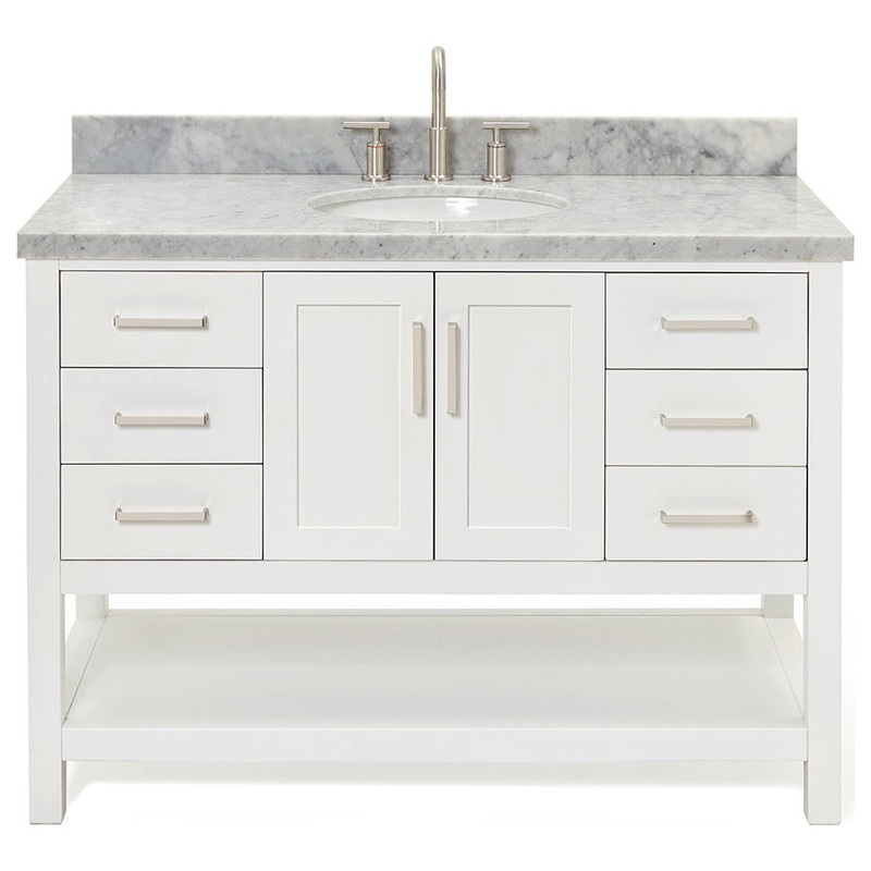 Our Magnolia bathroom vanity collection is handcrafted of solid wood to ensure quality and durability. By combining a top drawer, middle open shelf, we’ve created a functional piece for any bathroom. The open shelf at the bottom is a great place to store your accessories or keep toiletries within easy reach. A wide variety of options are available such as countertop material, sink shape, and cabinet color. Included Components: Wood vanity cabinet with 2 doors and 6 drawers Marble vanity top with a single sink and backsplash Faucet is not included and must be purchased separately Cabinet Features: Constructed from wood providing a lifetime of durability Free standing installation vanity is seated on the floor with wall anchors, providing a functional design Double door design provides easy access to storage space 6 full extension drawers with soft-close slides allow for organized storage Soft close drawer slides operate on smooth ball-bearings and prevent drawers from slamming shut Vanity will need to be assembled Vanity Top Features: Marble vanity top includes 1 sink 3 pre-drilled faucet holes Center drain location provides optimal draining capability Vanity top includes matching backsplash Cabinet Specifications: Cabinet Width: 48″ (from left to right) Cabinet Height: 34-1/2″ (from top to bottom) Cabinet Depth: 21-1/2″ (from front to back) Number of Doors: 2 Number of Drawers: 6 Vanity Top Specifications: Vanity Top Width: 49″ (left edge to right edge) Vanity Top Depth: 22″ (front edge to back edge) Backsplash Height: 4″ Number of Basins: 1 Sink Measurements: 19-5/8″ L x 16″ W x 8-1/4″ H Sink Basin Measurements: 17-3/4″ L x 14-1/8″ W x 7″ H Number of Faucet Holes: 3 Faucet Centers: 8″ (distance between the installation holes for the faucet handles)