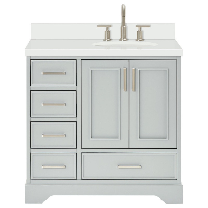 The Stafford 37″ bathroom vanity combines traditional style with elegance, making it an ideal choice for any bathroom space. Hardwood & plywood construction ensures lasting beauty and durability. Ample storage space, including a cabinet and dovetail drawers, ensures functionality. The white quartz countertop adds a touch of sophistication. Complete with brushed nickel hardware, this stunning vanity is the perfect upgrade for your bathroom.
